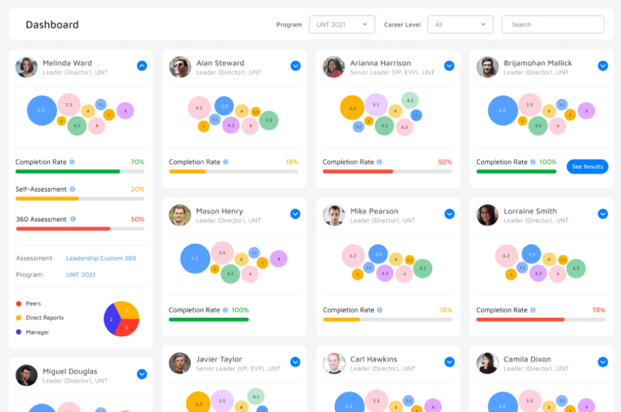Specifically a functionality only for coaches. A coach can access all the mentees and rater data on one chart to understand the data hollistically and give collective feedback.