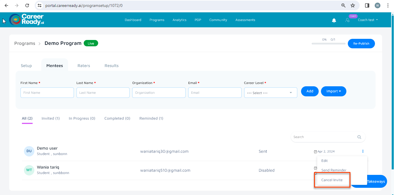 In the selected program, go to the mentee or rater tab to whom you want to cancel the invite for the assessment.