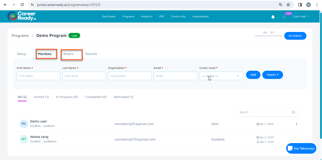 for the assessment. The selected mentee/rater will be disabled from the program.