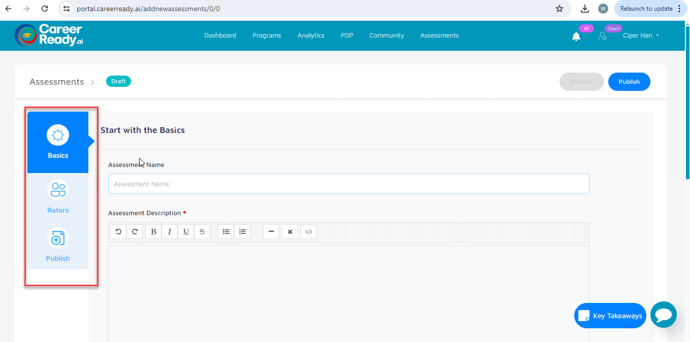 In the basics tab, you can set the assessment name, and description and select the assessment type.