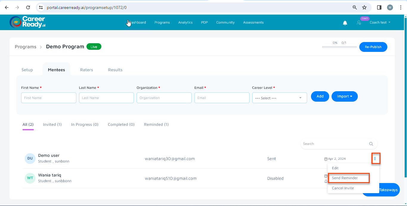 Next to each mentee, click on the three dots and you can send the reminder to the mentee/rater for the assessment